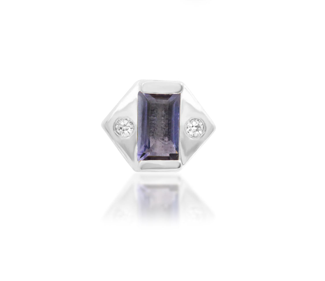 Katia by Junipurr Jewellery brings refined structure and elegant colour together in a striking gemstone composition. Featuring a baguette-cut natural Iolite paired with two round White Cubic Zirconia stones, this design balances crisp geometry with soft brilliance.